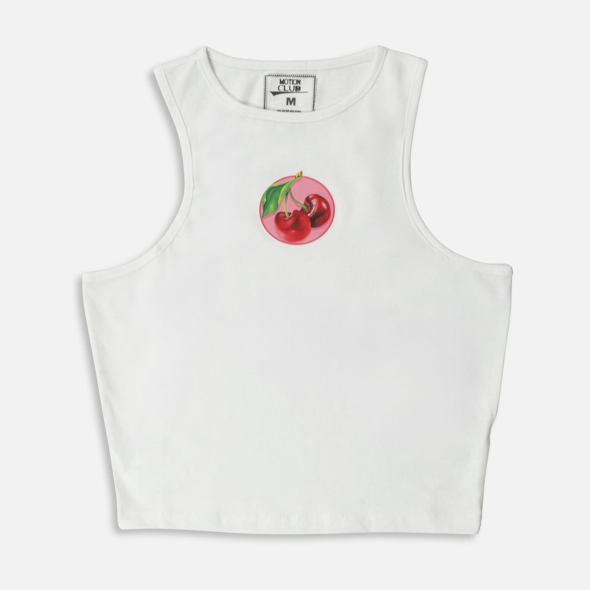 The Club proudly presents our custom cherry body-con tee, a striking piece that perfectly combines style and comfort. This sleeveless tank features a vivid cherry realism design, elegantly encased in a central circle, creating a captivating focal point. The form-fitting silhouette accentuates your figure. Elevate your wardrobe with this unique and stylish addition.